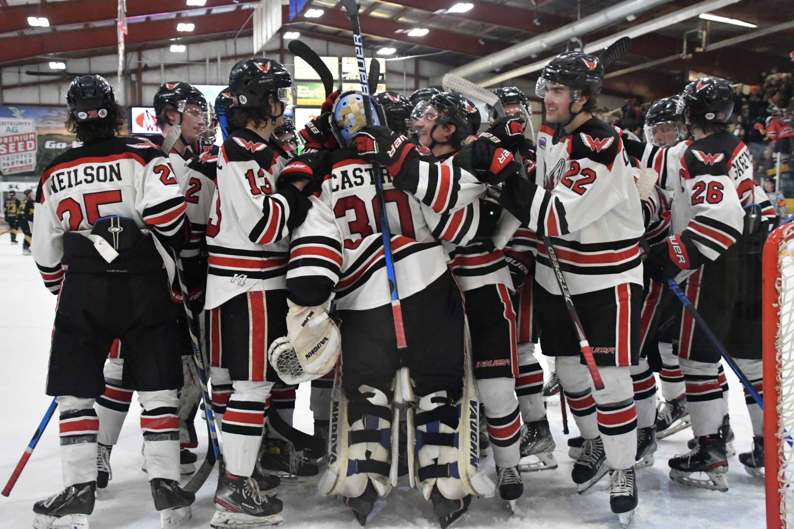 Bismarck knew they needed one more goal to tie the game again but the Wings’ defense prevailed in the final period. In fact, Aberdeen even killed off a late penalty in the game’s final minutes, fending off a six-on-four attack when Spinnars Nordin was pulled from between the pipes with 1:23 remaining on the clock. And when the final horn sounded, Aberdeen maintained their 3-2 lead for the victory.