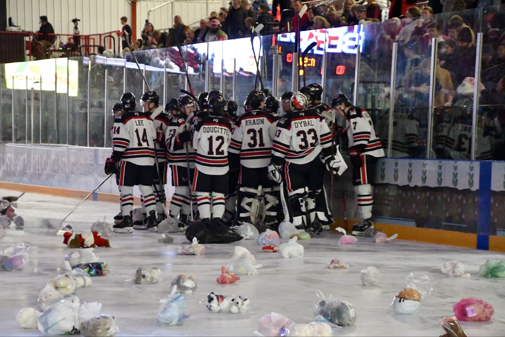 (Saturday, Feb. 7 – Odde Ice Center, Aberdeen, SD) Saturday’s game would have quite the turnaround for the Wings, and it would be Teddy Bear Toss night! Just 2 minutes and 10 seconds into the first period, Jibber Kuhl would make the Teddy Bears fly after scoring the first goal of the game with assists coming from Matthew Martin and Finn Safir! Shortly after, the Wings would find themselves on the Penalty Kill, but instead of Minot getting a Power Play goal, Aberdeen would get a shorthanded goal instead when Matthew Martin would score on a breakaway with assists from Finn Safir and Jibber Kuhl. In the second half of the period, Minot would be able to tie things up with goals from clogging the crease. The first being scored by Briggs Knott at the 7:47 mark, and the second being scored by Lucca Ori with just 2 seconds remaining in the period. The game would be tied at 2 heading into the second period of the night.